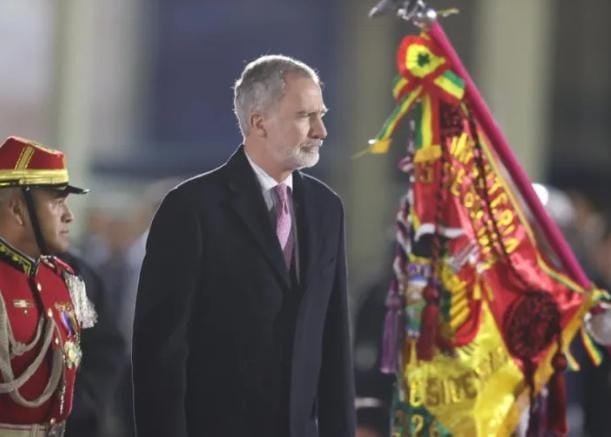 El monarca español Felipe VI llegó a la plaza Murillo de La Paz, donde fue recibido con honores por el regimiento Co...