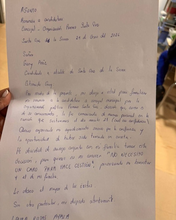 La exdiputada Laura Rojas oficializó su renuncia irrevocable a la candidatura como concejal por la agrupación Primero Santa Cruz, liderada por Gary Áñez.